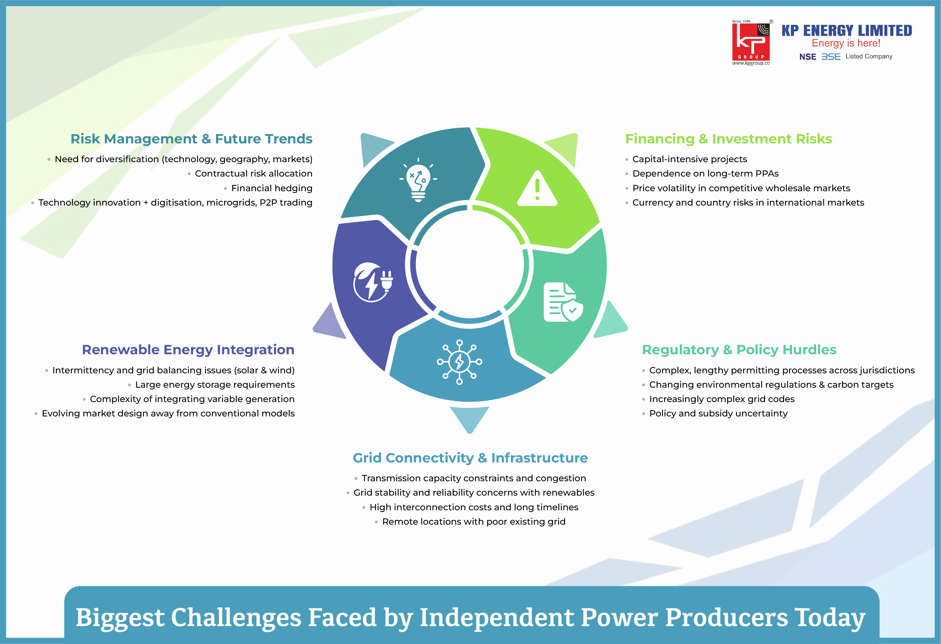 The global energy industry has experienced tremendous changes in the past 10 years, with new Independent Power Producers (IPPs) becoming critical to support the world's increasing need for electricity. Despite the increasing importance of IPPs, challenges faced by independent power producers are equally confronted with threats to their operational efficiencies, financial sustainability, and ultimately their future. Many of these IPP challenges in the power sector are amplified and complicated by developmental changes in power markets, rapid onc-regulatory changes, and increasing competition.