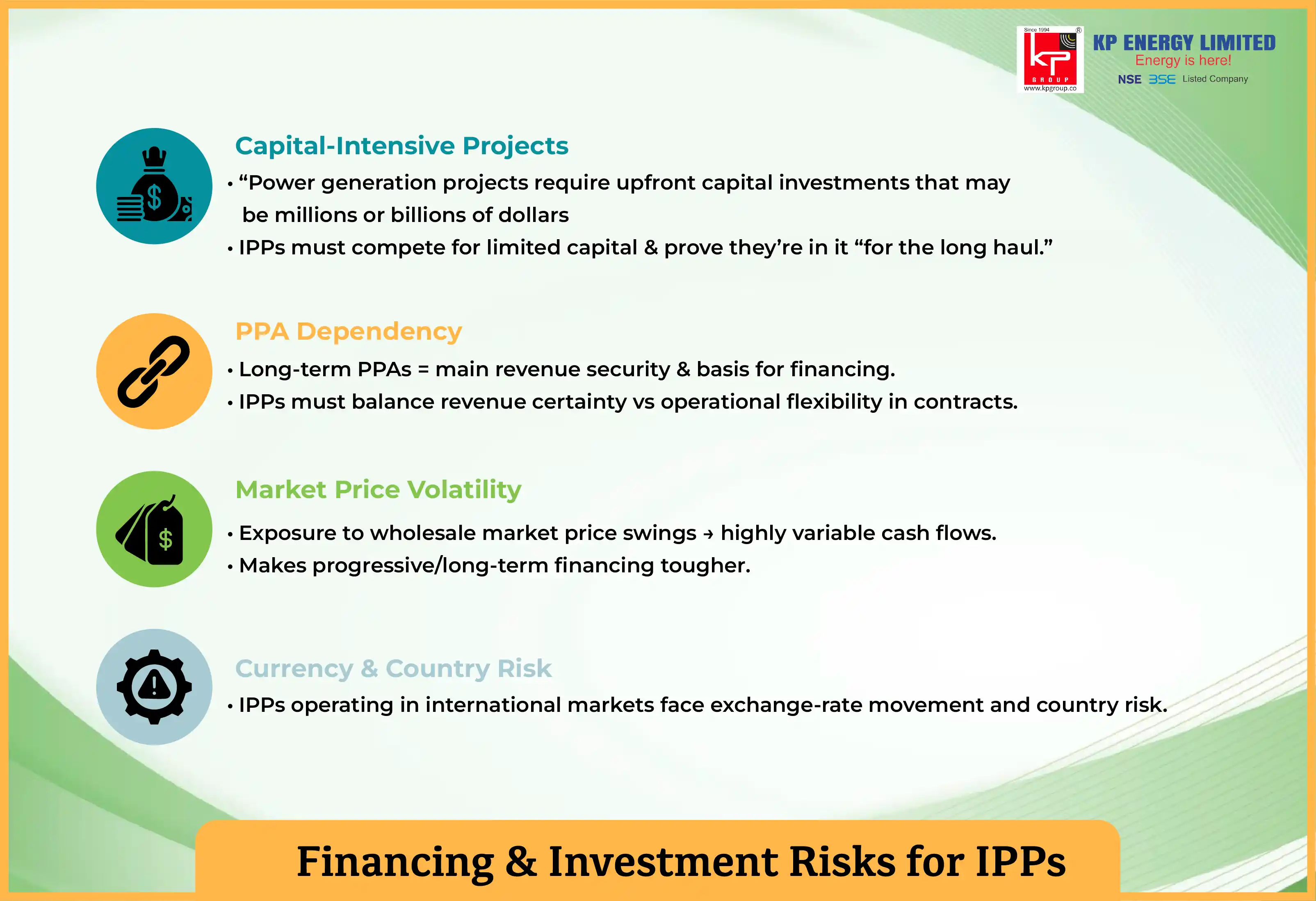 There are many financial dilemmas that IPPs encounter, including project financing, commodity price fluctuations, Power Purchase Agreement negotiations, and currency and country risks when operating in international markets. Aside from these financial problems, IPPs are also faced with the capital-intensive aspect of power generation and face competition for investment capital.